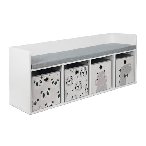 Relaxdays children's bench with storage, HWD: 72 x 79 x 31 cm, 2 foldable boxes, bookshelf, padded seat, white/grey, Fibreboard, Polyester, Foam