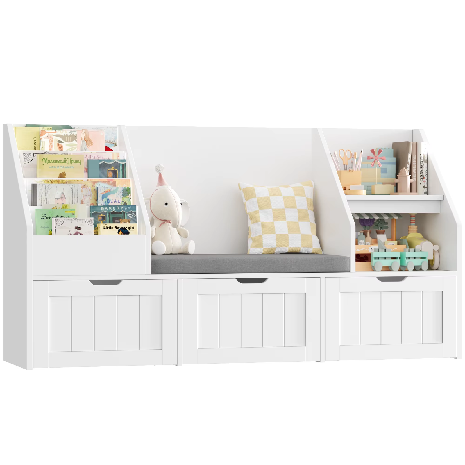 Childrens Bookshelf Storage Bench with Drawers Shelves Reading Seat White 140cm