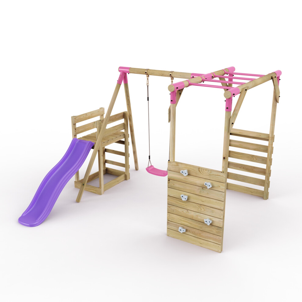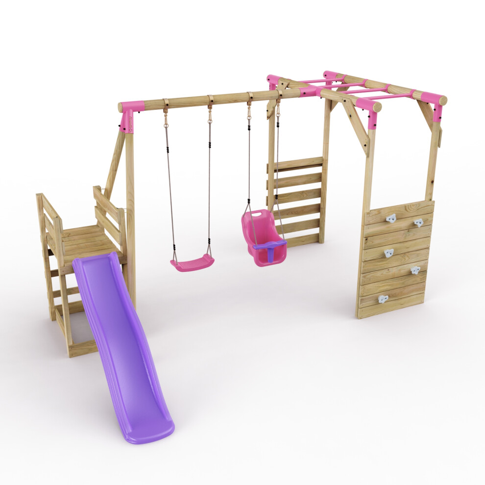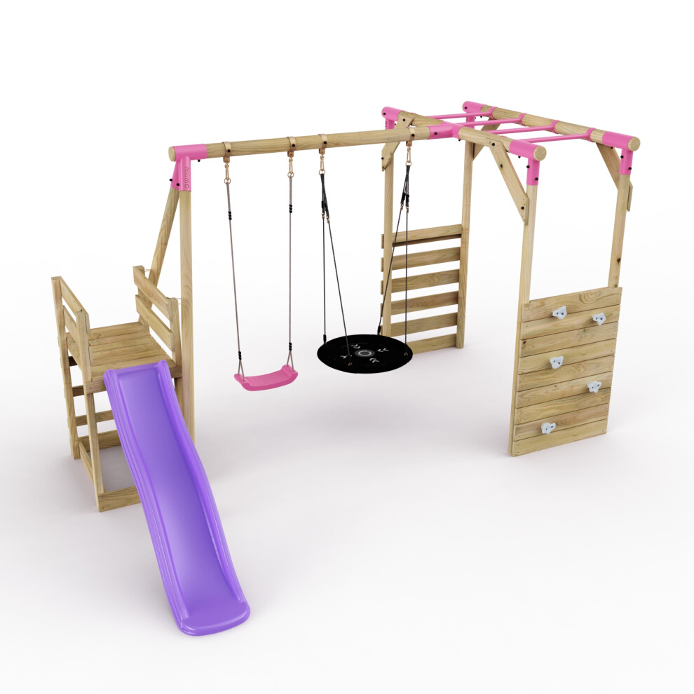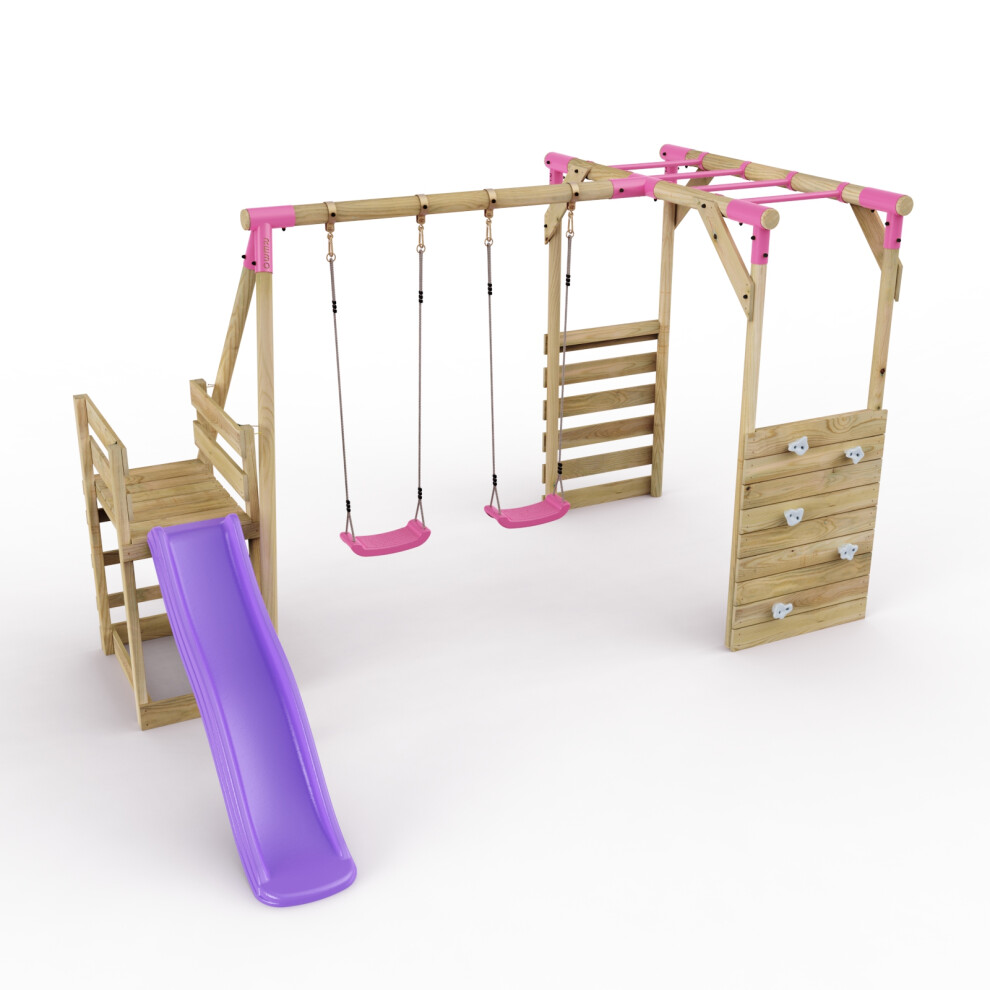 Rebo® Adventure Playset Wooden Climbing Frame, Swing Set and Slide - Rainier Pink | OutdoorToys | Kids' Outdoor Wooden Garden Play Equipment, Children's Jungle Gym