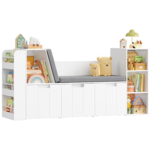 HOCSOK Kids Bookshelf, Children's Bookcase with Reading Nook, 4-in-1 Toy Storage Unit with Seat Cushion, Toy Organiser with 3 Rolling Toy Chest & 4 Storage Cubes, for Bedroom, Playroom, Nursery, White