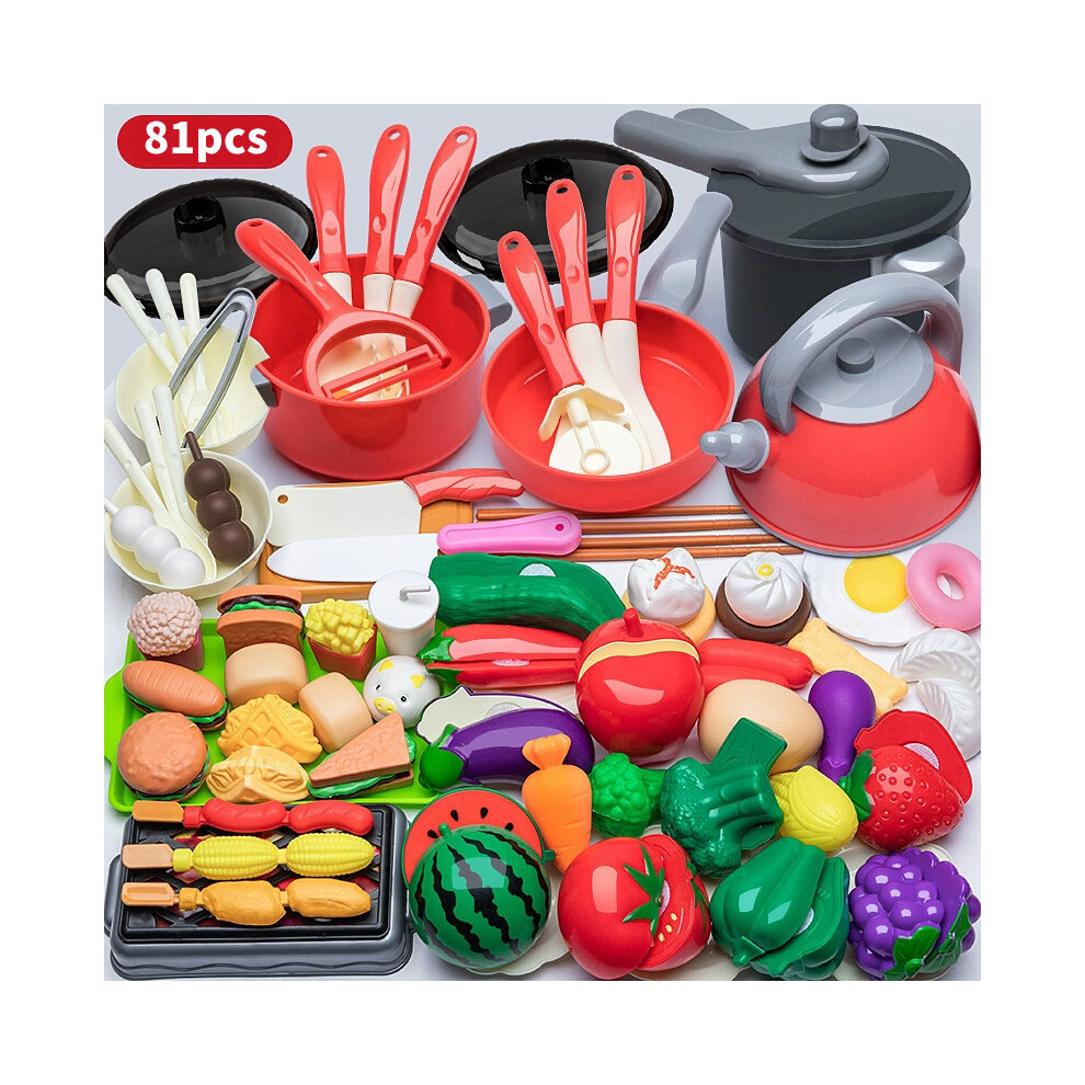 (Red 81pcs) Toy Childrens Kitchen Playset With Fake Stove And Food Items Cooking Fun For