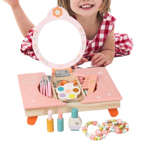 Dress-Up Toy Vanities | Wooden Dressing Table with Mirror - Folding Pretend Play Girls Vanity Set with Comb and Cosmetics,for Birthday Christmas Salon Studio Home Children's Room