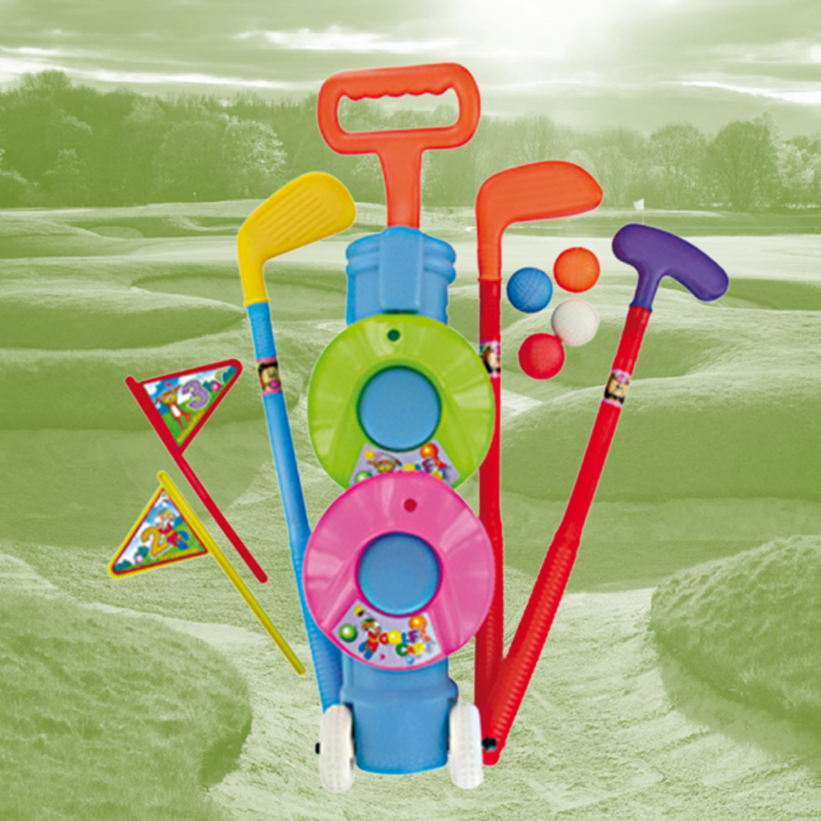 Childs Kids Plastic Starter Golf Set, Clubs, balls, holes, Trolley and flags