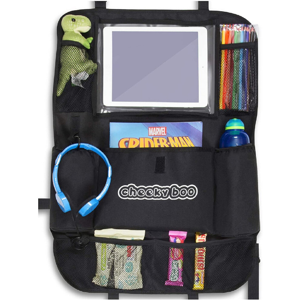 CheekyBoo - Child's Large Car Backseat Organiser with 10.1" Touch Screen iPad/Tablet Holder for Kids and Toddlers. Black Car Storage and Seat