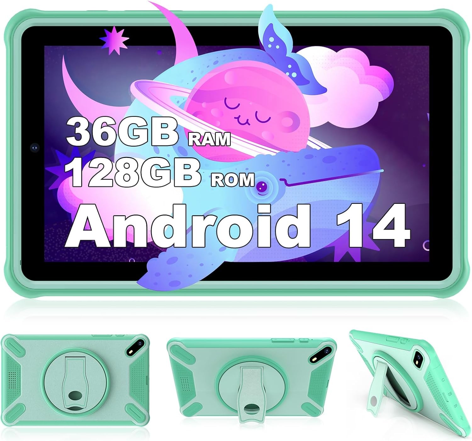 DEEMWOLF 7 inch Tablet Android 14,36GB (12+24) + 128GB/1TB TF child tablet,WIFI6/BT5.0,8000mAh,Eye Protection Children's, Parental Control Mode,Education Tablets(Green)