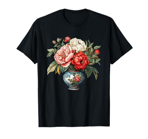 Vintage Peony Bouquet in Ornate Blue China Vase T-Shirt