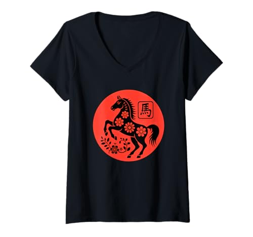 Womens Red Horse Chinese Zodiac Lunar New Year 2026 Fire Horse V-Neck T-Shirt