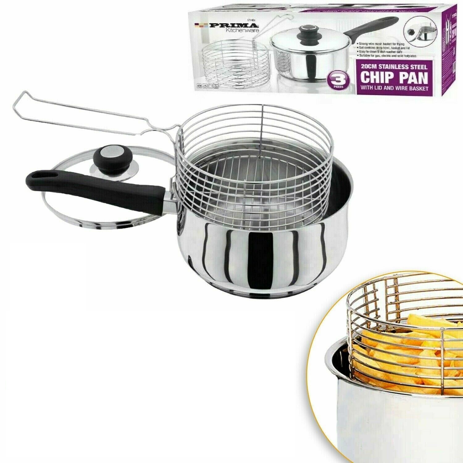 New 20cm 3pc Stainless Steel Chip Pan Fryer Induction with Wire Basket Glass Lid