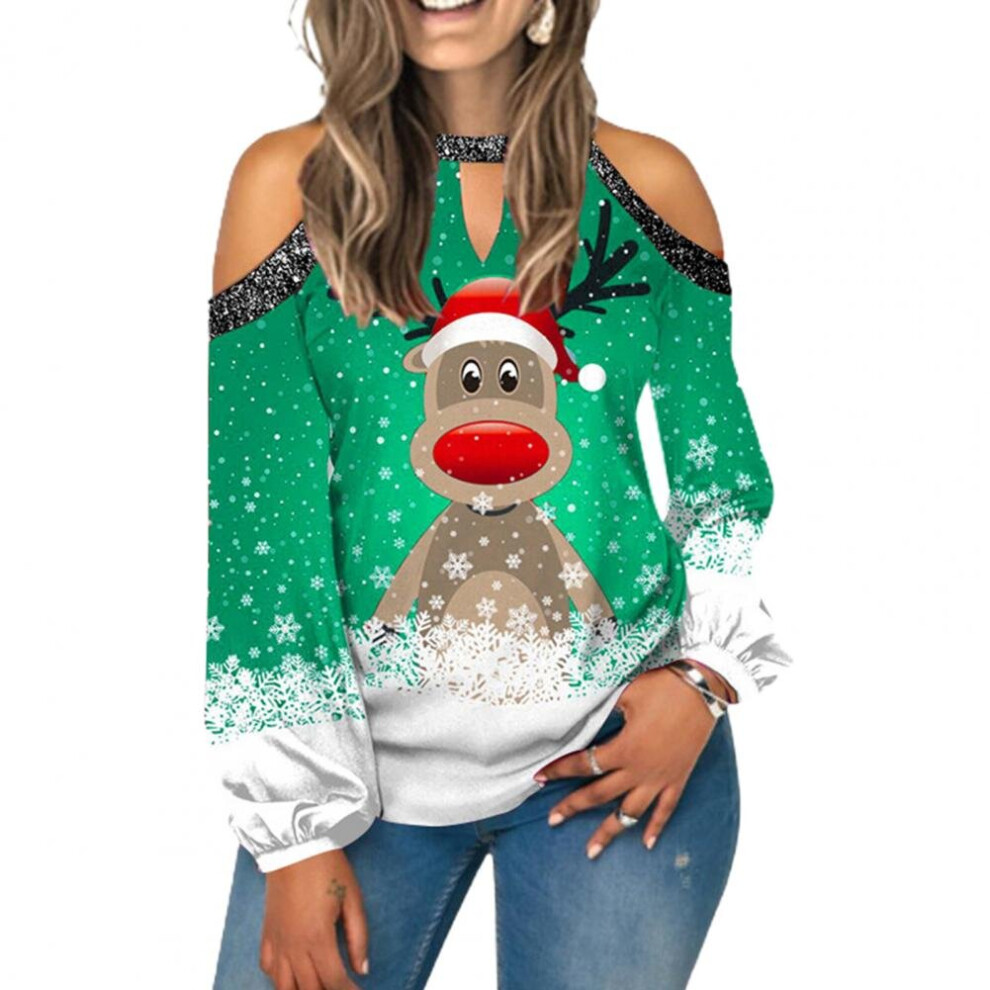 Xmas Blouse Christmas Print Top Halter Hollow Out Long Sleeve Xmas Blouse Women Blouse Women Blouse