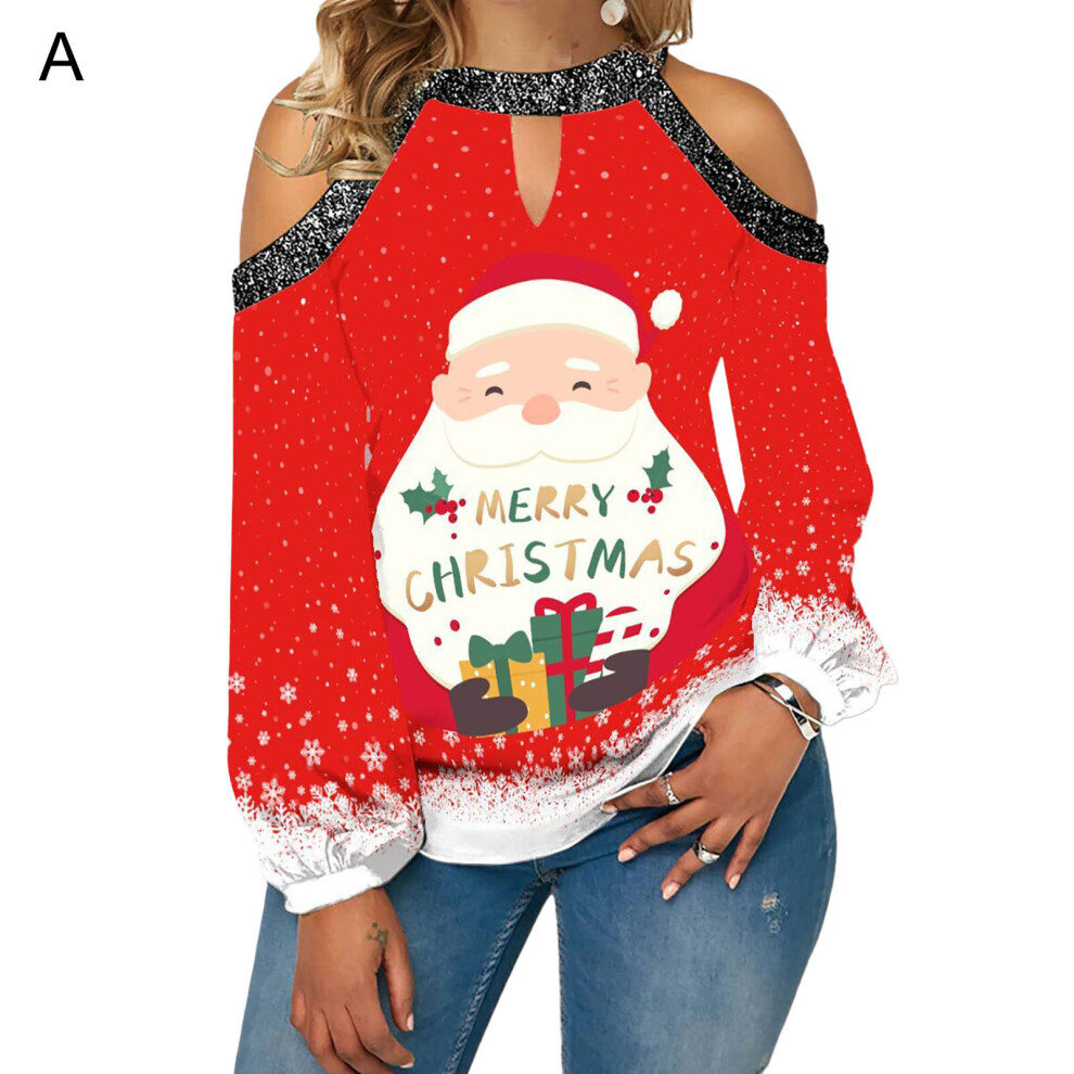 Classic Off Shoulder Casual Xmas Blouse Skin-friendly Casual Blouse Christmas Print Women Blouse for Daily Wear