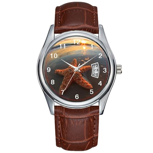 Men Watch Casual Waterproof Quartz Watches Clock Date Classic Business Brown Leather Christmas Wristwatch Starfish and Bubbles at Sunset Wrist Watch, Brown, commercial