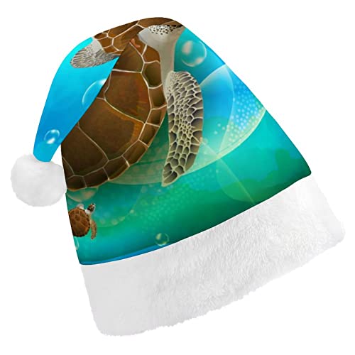 Brown Sea Turtles Bubbles Turquoise Blue Ocean Sea Water Christmas Hat, Santa Hat, Xmas Comfort Holiday Hat for Adults, for Christmas Party New Year Festive Holiday Home Decorations