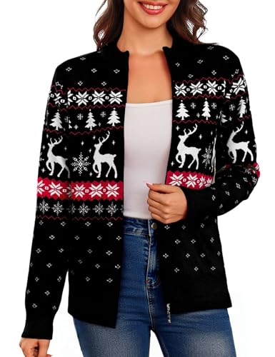 Aottori Christmas Cardigans for Women UK Open Front Christmas Jumpers Ladies Long Sleeve Zip Up Xmas Cardigan Sweaters Novelty Reindeer Snowflakes Knitwear Black XL
