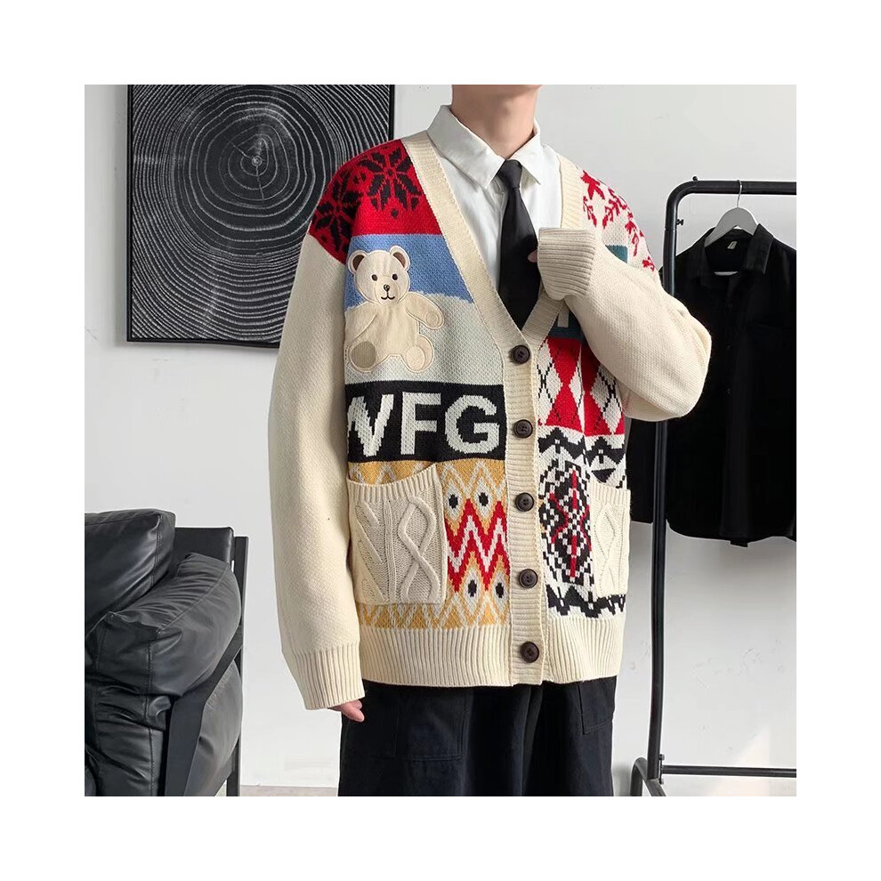 Ugly Christmas Men Cardigans Patchwork Bear Casual Sweater Gengar Clothing Knit Streetwear Coat Oversized Cardigan Unisex