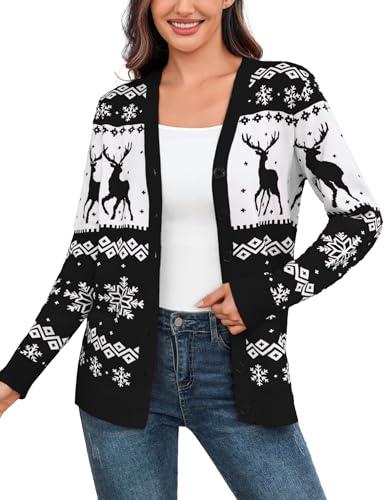 Aottori Womens Christmas Cardigans Knitted Button Down V Neck Sweater Open Front Reindeer Snowflake Knitwear Ladies Long Sleeve Winter Jumper Outerwear Black XL