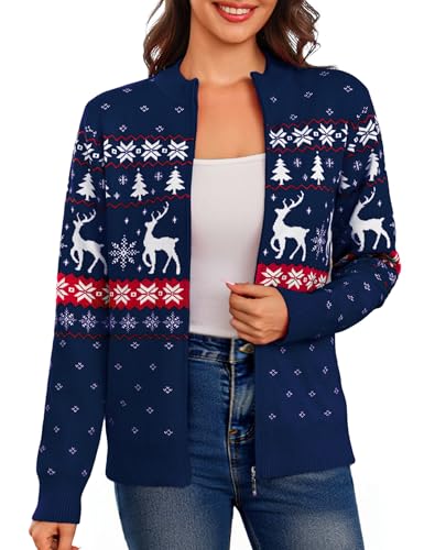 Aottori Christmas Cardigans for Women UK Open Front Christmas Jumpers Ladies Long Sleeve Zip Up Xmas Cardigan Sweaters Novelty Reindeer Snowflakes Knitwear Navy XL