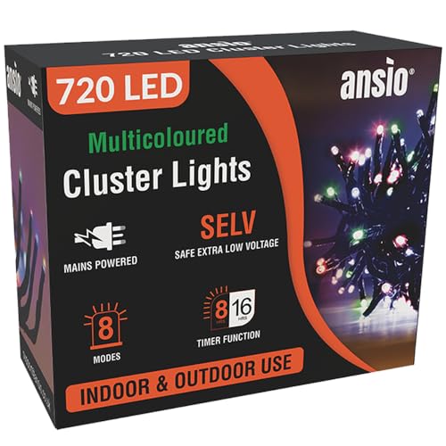 ANSIO® Outdoor Christmas Lights 720 LED 9m/29ft - Multicoloured Cluster Christmas Tree Lights for Indoor & Outdoor Decorations Fairy Lights with Timer | Mains Powered - Green Cable