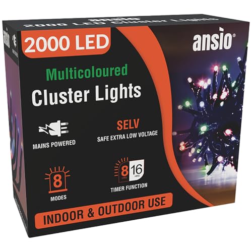 ANSIO® Christmas Lights 2000 LED 24m/78ft Cluster Christmas Tree Lights for Indoor & Outdoor Multicoloured Decorations Fairy Lights with Timer for Xmas Garden & Party | Mains Powered Green Cable…