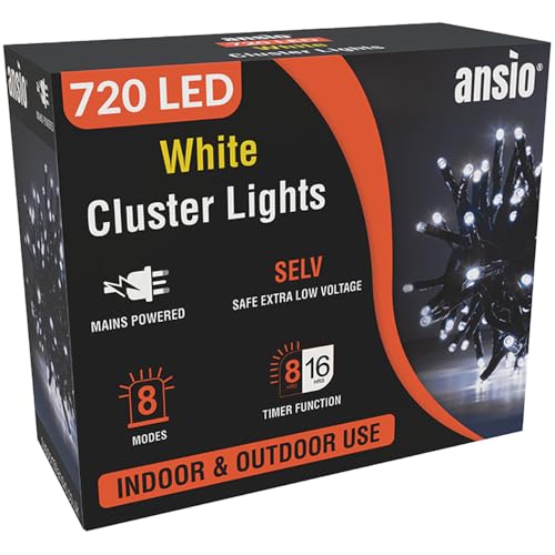 ANSIO® Christmas Lights 720 LED 9m/29ft Cluster Christmas Tree Lights for Indoor & Outdoor Cool White Decorations Fairy Lights with Timer for Xmas Garden Bedroom & Party | Mains Powered Green Cable