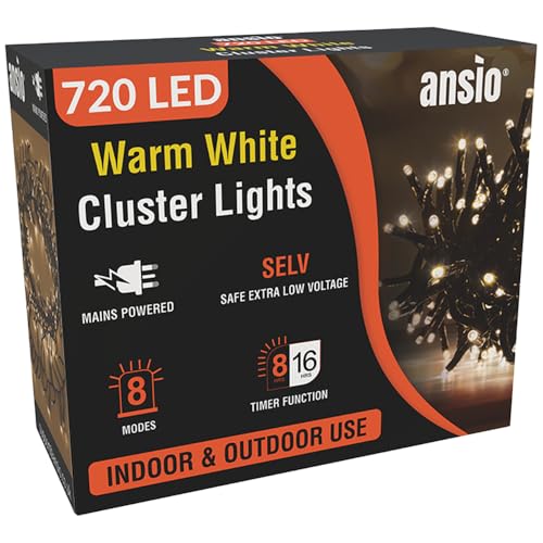 ANSIO® Christmas Lights 720 LED 9m/29ft Cluster Christmas Tree Lights for Indoor & Outdoor Warm White & Cool White Decorations Fairy Lights with Timer for Xmas Garden & Party | Mains Powered