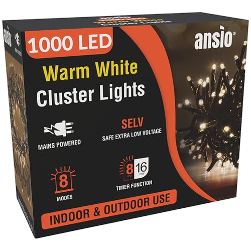 ANSIO® Christmas Lights 1000 LED 12m/39ft Cluster Christmas Tree Lights for Indoor & Outdoor Warm White Decorations Fairy Lights with Timer for Xmas Garden & Party | Mains Powered Green Cable