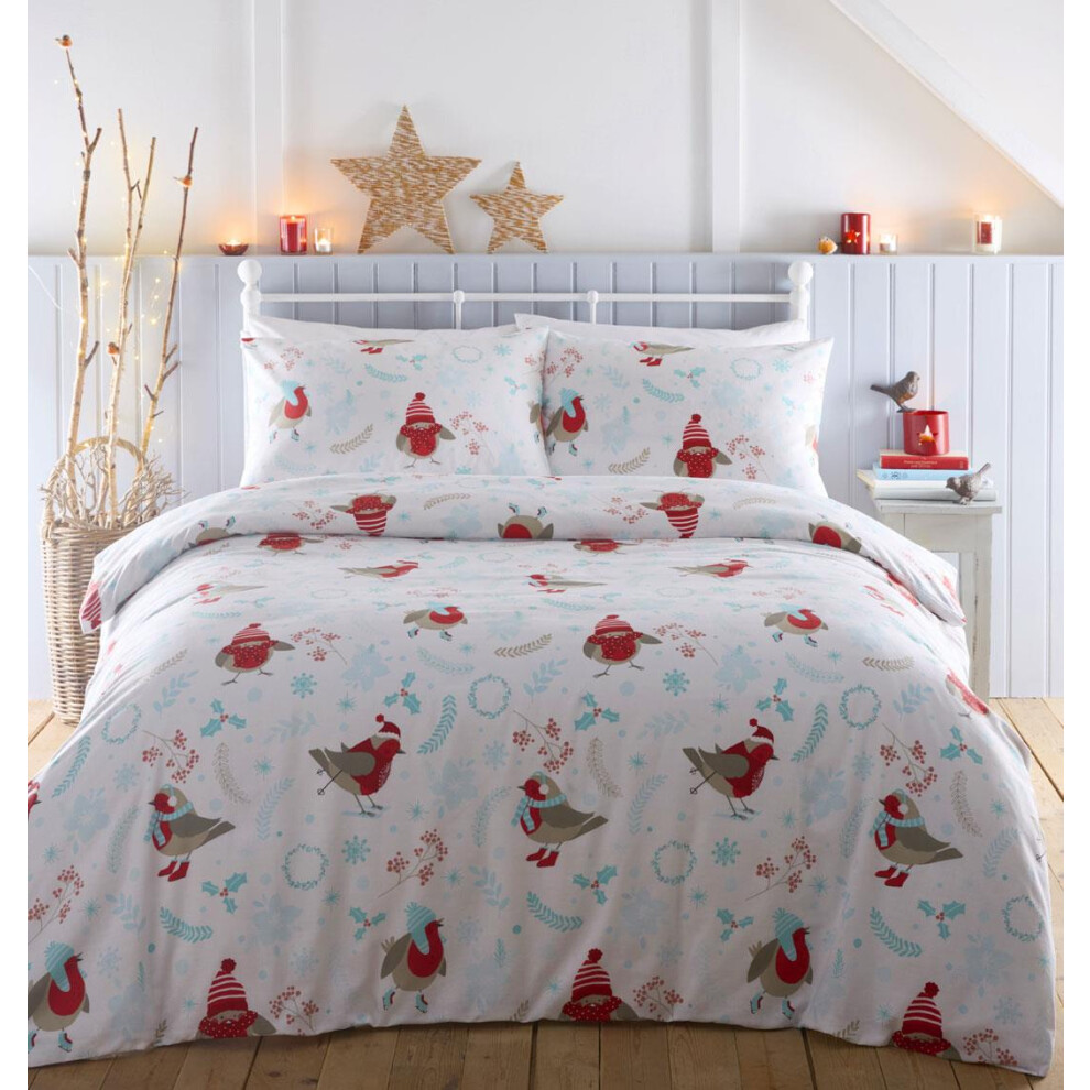 Catherine Lansfield Christmas Party Robins Reversible Double Duvet Cover Set with Pillowcases Grey