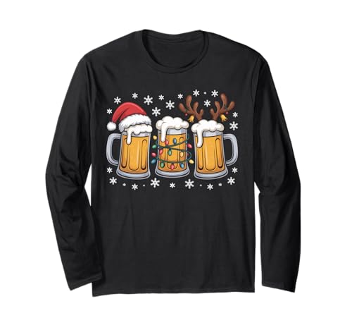 Christmas Beer Lovers Mugs Santa Reinbeer Tree Lights Xmas Long Sleeve T-Shirt