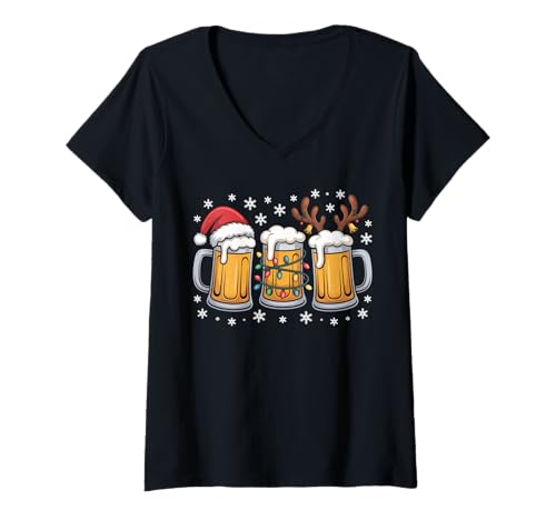 Womens Christmas Beer Lovers Mugs Santa Reinbeer Tree Lights Xmas V-Neck T-Shirt