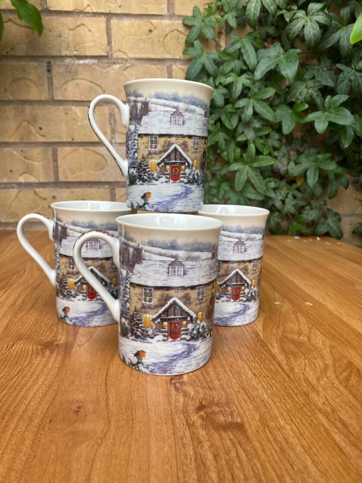 Set of 4 Fine China Mugs Christmas Robins Theme Design Mugs