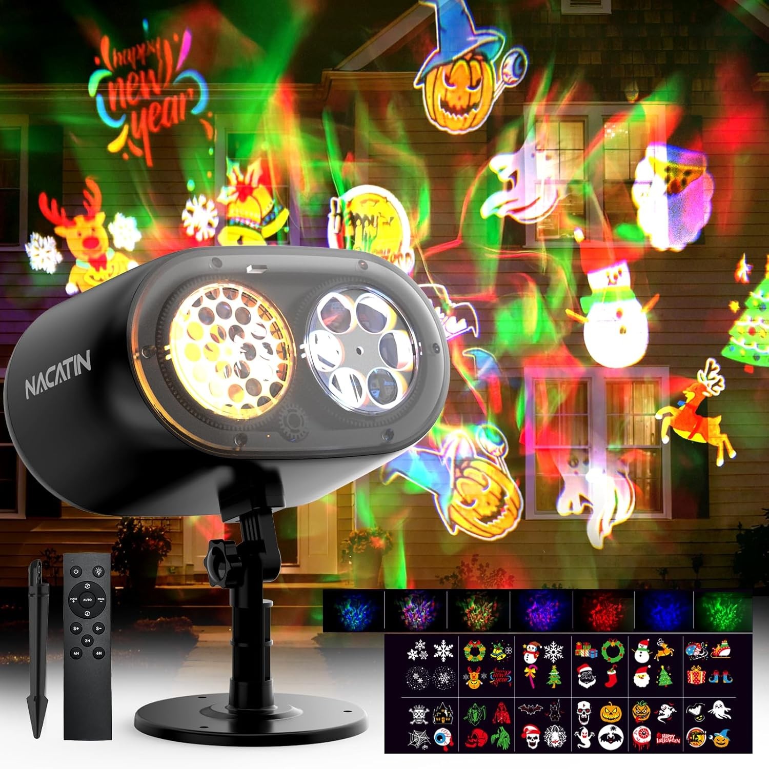 NACATIN Christmas Halloween Projector Lights Outdoor, 2-in-1 No-Card Design with Remote, 12 HD Patterns & 7 Ocean Wave Effects, IP65 Waterproof Holiday Projector for Yard, Garden, House Decor