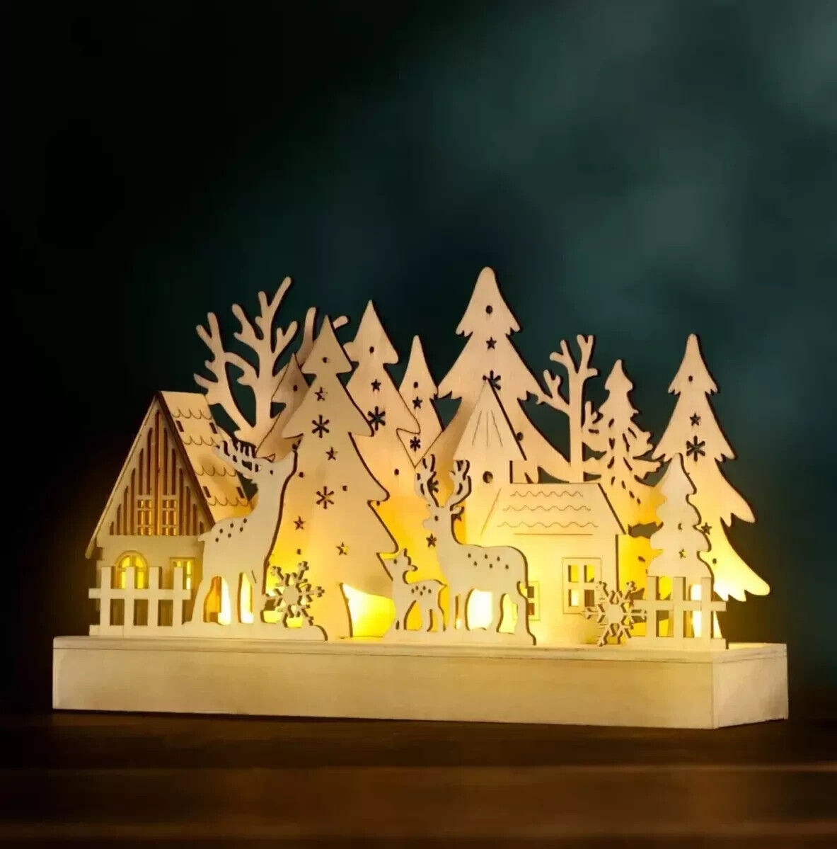 Christmas Wooden Scene Ornament Reindeer Stag LED Light Up Home Decoration Xmas
