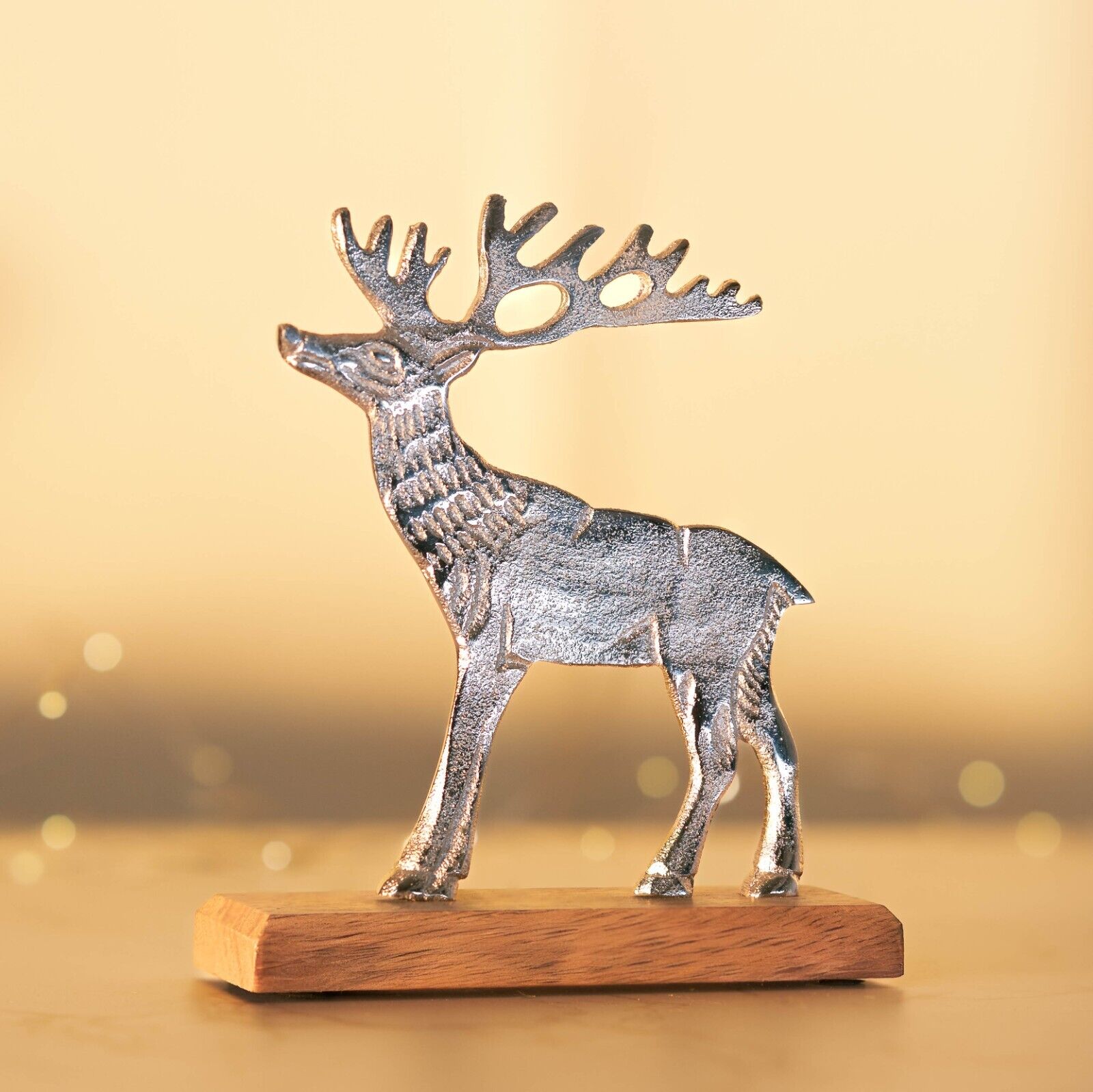 Christmas Reindeer Stag Ornament Metal Wood Decoration Silver Home Decor Xmas