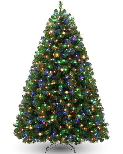 Pre Lit Christmas Tree 6ft, Artificial Xmas Tree with 250 Multi Colour LED Lights, 8 Light Modes, Bushy 1000 Branch Tips, Foldable Metal Stand, for Home Office Party Holiday Decoration