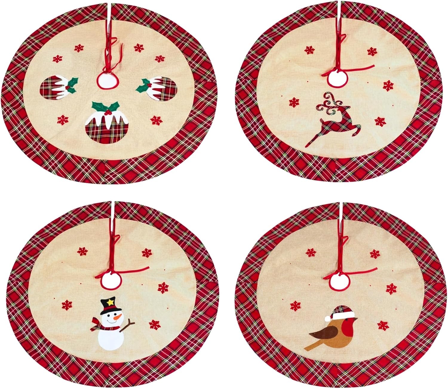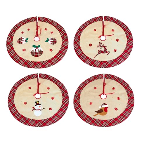 86cm Pack of 4 Assorted Christmas Tree Skirts, Burlap Hessian Linen Xmas Tree Base Covers with Snowflake Print Including Christmas Pudding, Reindeer, Robin and Snowman Designs for Holiday Decorations