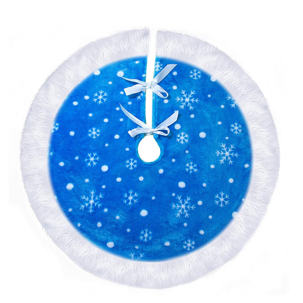 Christmas Tree Skirts for Holiday Season, Snowflake Christmas Decorations with Fluffy Fur Trim, Blue with White Trim Round Tree Mat for Winter Wonderl