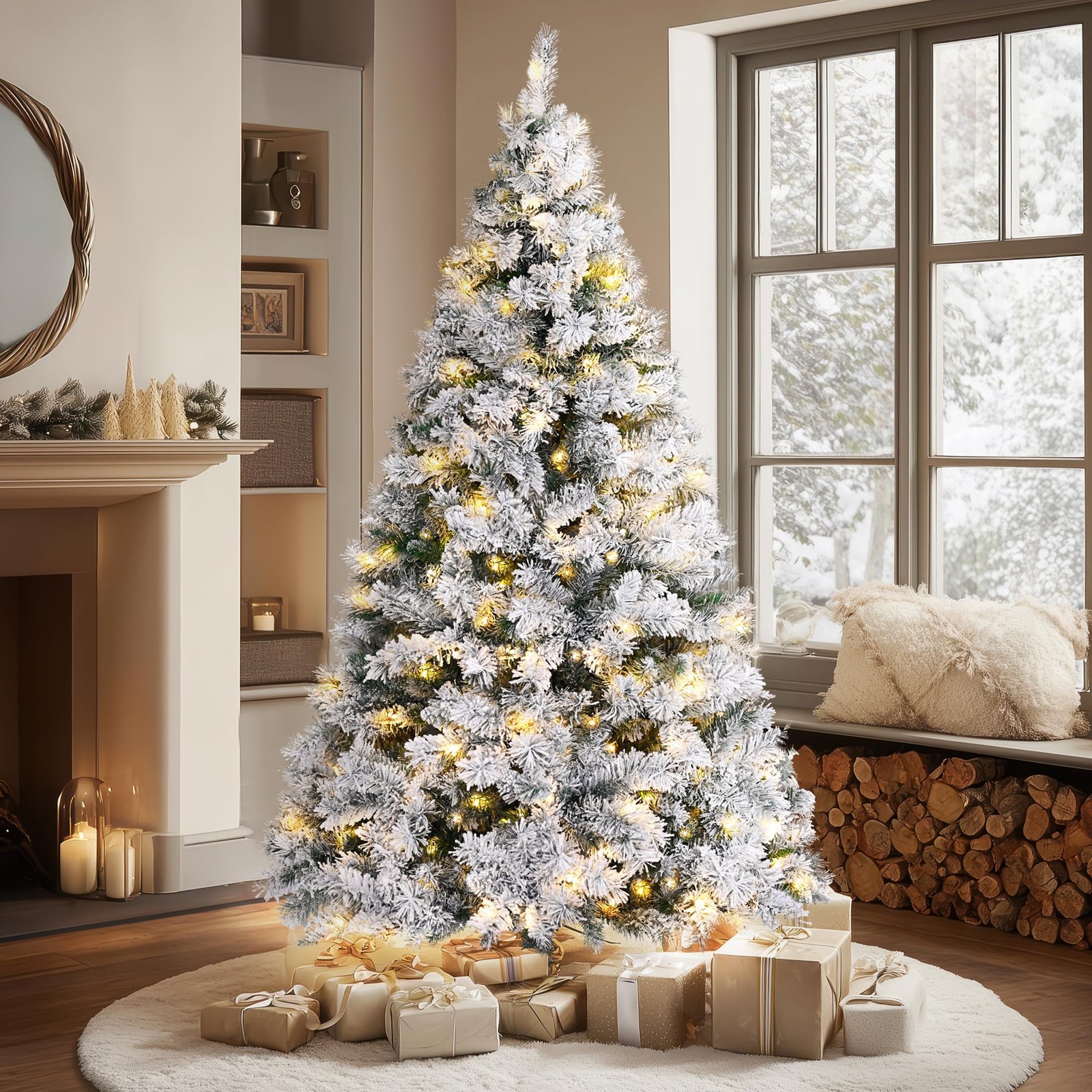 VeryMerry 6FT Pre Lit Snowy Christmas Tree with 300 Built-In Warm White LED Lights with Auto-Off Timer, 8 Lighting Modes, Foldable Metal Stand, Snow Flocked Artificial Tree