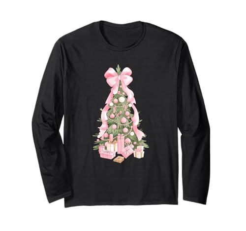Aesthetic Christmas Tree with Pink Bow Coquette Girly Xmas Long Sleeve T-Shirt