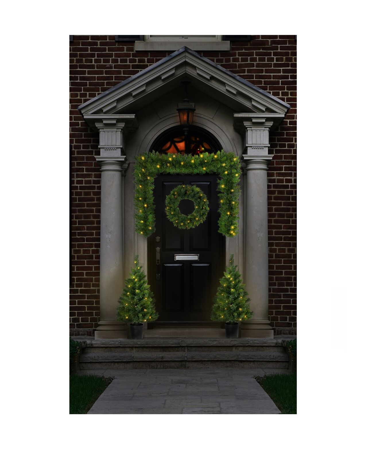 Christmas Door Porch Decoration Set Pre Lit Pine Wreath Garland & Trees On Timer