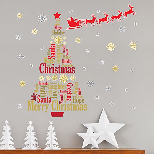 Wallflexi Christmas Decorations Wall Stickers "Santa's Sleigh with English Quotes Christmas Tree" Wall Murals Decals living Room Children Nursery School Restaurant Cafe Hotel Home Office Décor, multicolour