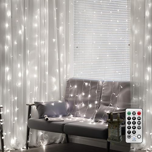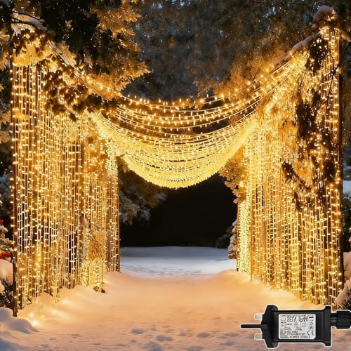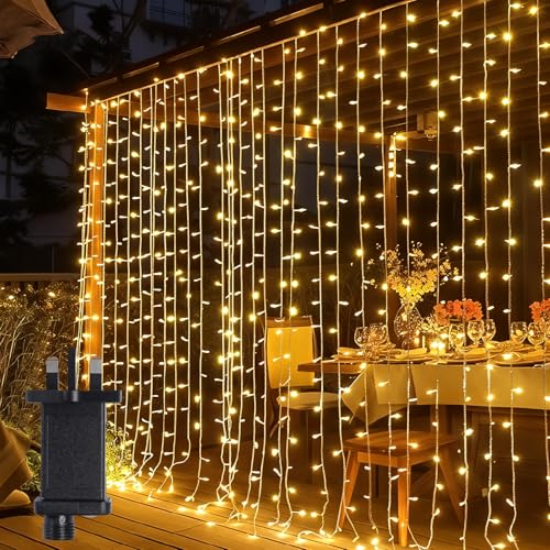 Dekofun 600 LED Curtain Fairy Lights 6m x 3m Hanging Gazebo Light Mains Powered With Timer, 8 Modes Waterproof Christmas Window Lights, Waterfall light for Wedding Wall Xmas Indoor Outdoor Decorations
