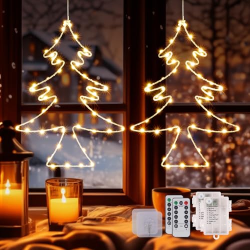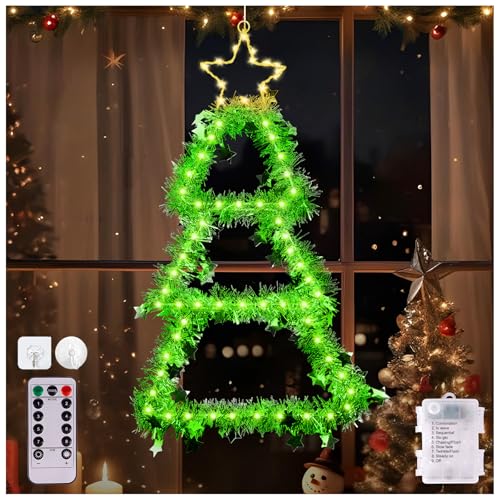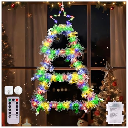 Christmas Window Lights, Christmas Tree Window Lights Battery Powered, 8 Modes Christmas Lights Indoor Outdoor with Timer, Remote Control Window Hanging Christmas Lights for Window Wall Xmas Tree