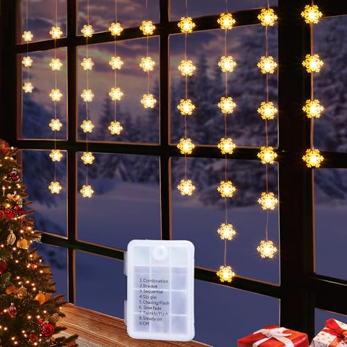GlobaLink Christmas Window Lights, 1.35mx70cm 50LEDs Battery Powered Snowflake Curtain Lights, Waterproof Snowflake Xmas Fairy Lights with 8 Modes for Indoor Outdoor Holiday Decorations