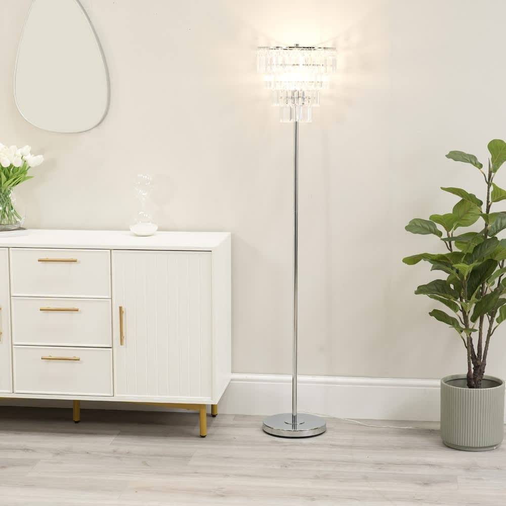 152cm Bellano Chrome Floor Lamp - White Linen With Clear Acrylic Droplets
