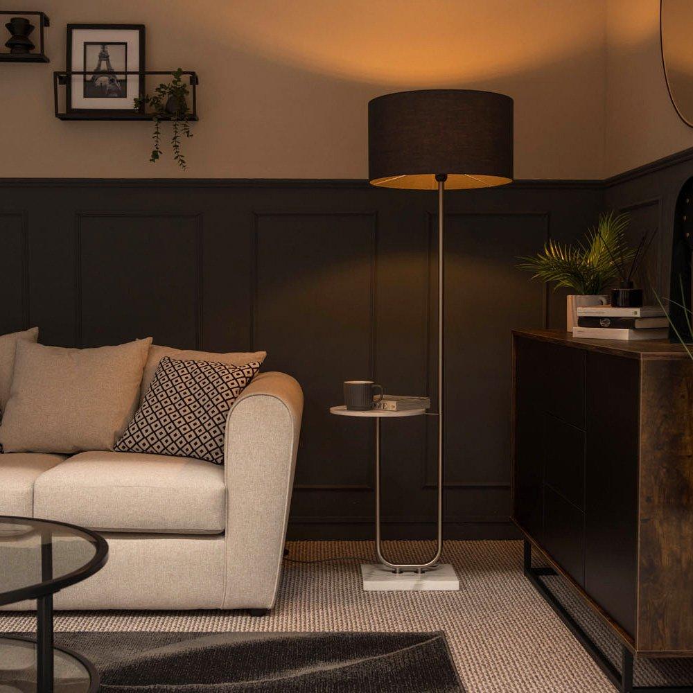 Tavel Brushed Chrome Marble Base Floor Lamp With Table And Large Charcoal Grey Shade