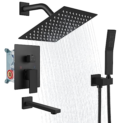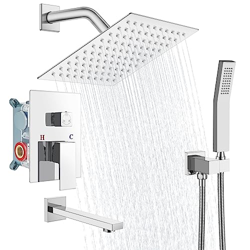 SLOPSS Polish Chrome Wall Mounted Shower System 8 Inch Shower Head Shower Faucet Set with Tub Filler Triple Function Shower Head Kit with Hand Held Sprayer Bathtub Faucet Set Rough-in Val