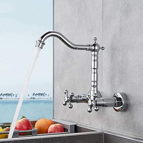 BDDCYWY Faucet, Chrome Polish Kitchen Faucet Wall Mount Dual Handle Hot and Cold Water Kitchen Sink Faucet Mixer Taps Bathroom Faucet 360 Degree Swivel