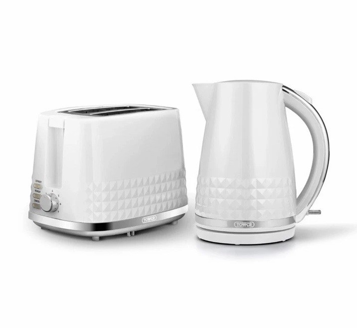 Tower Sonar White Kettle & 2 Slice Toaster. Chrome Accents Stylish Ripple Design