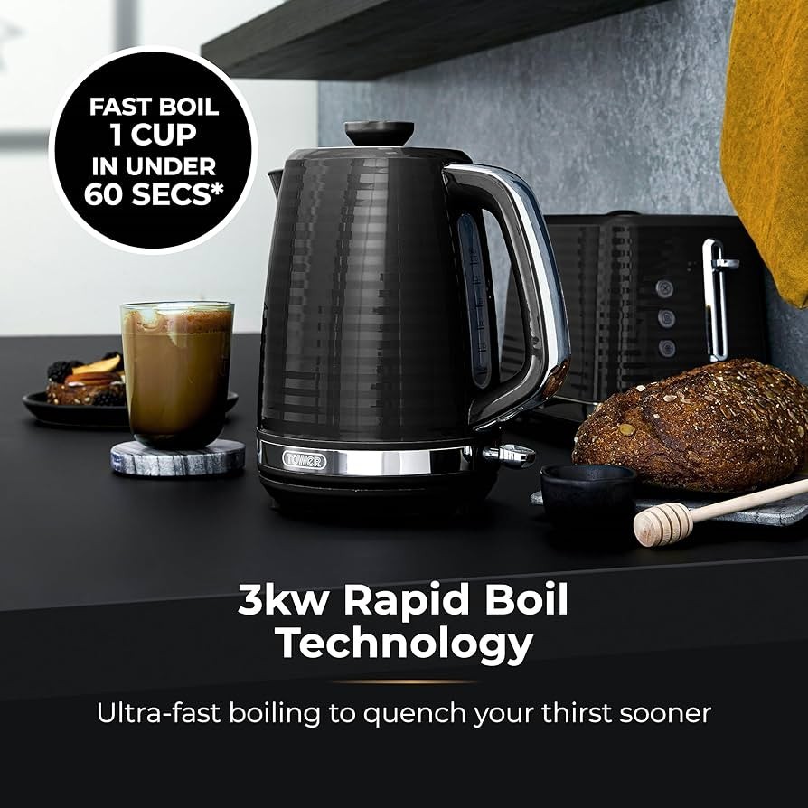 Tower Sonar Kettle & 2 Slice Toaster. Black/Chrome Accents Stylish Ripple Design