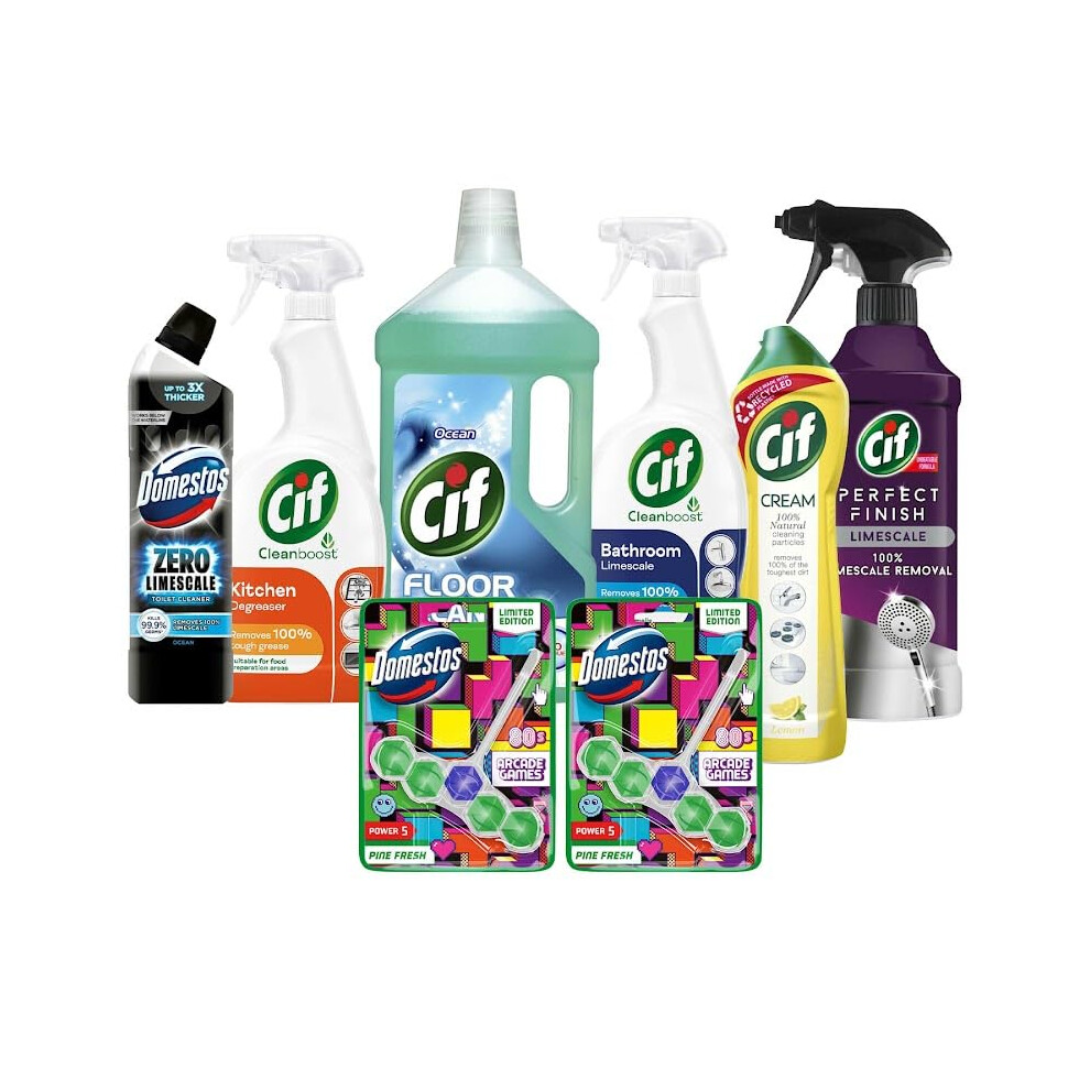 Cif & Domestos Cleaning Essentials Kit - Includes Cif Original Cream Cleaner, Ocean Floor Cleaner, Power & Shine Bathroom & Kitchen Sprays, Limescale