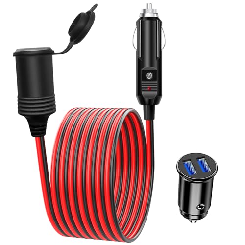 Hoembpn 1.5M/4.9FT 17AWG Car Cigarette Lighter Extension Lead Cable LED with Fuse 15A, 12V/24V Car mini Dual USB Charger Socket Cigarette Lighter Adapter Fast Charger Car Camping Accessories Red